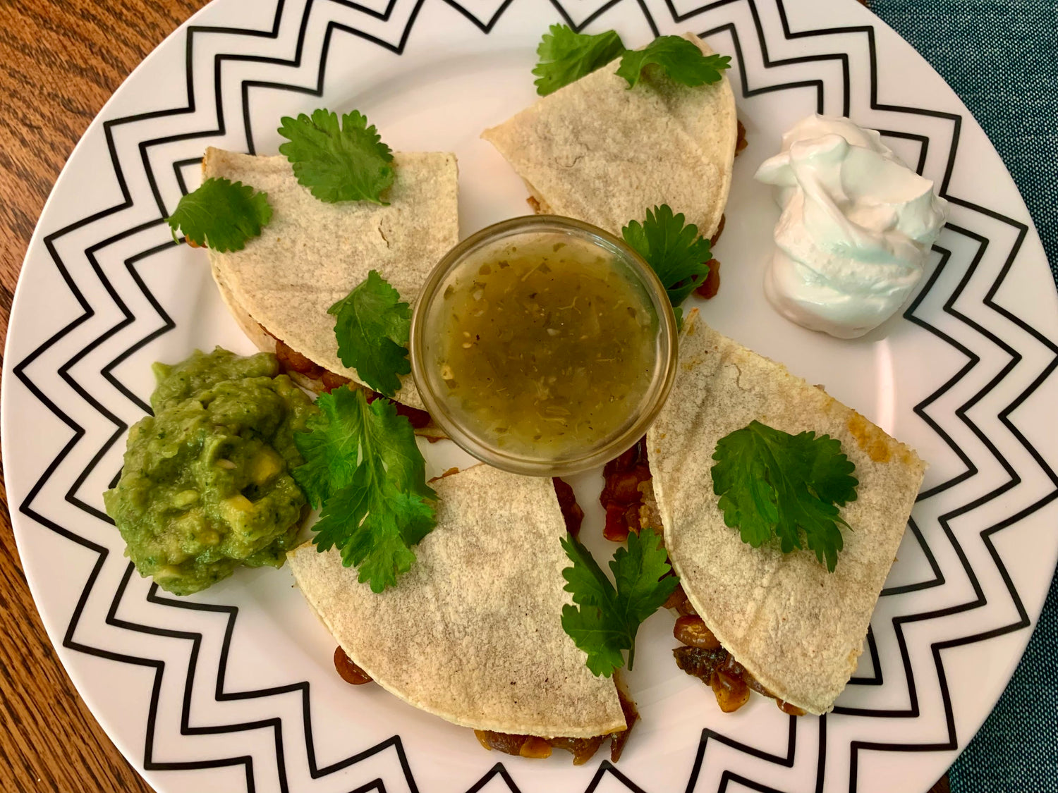 - Once the quesadillas are cooked, cut them into 4 triangles.