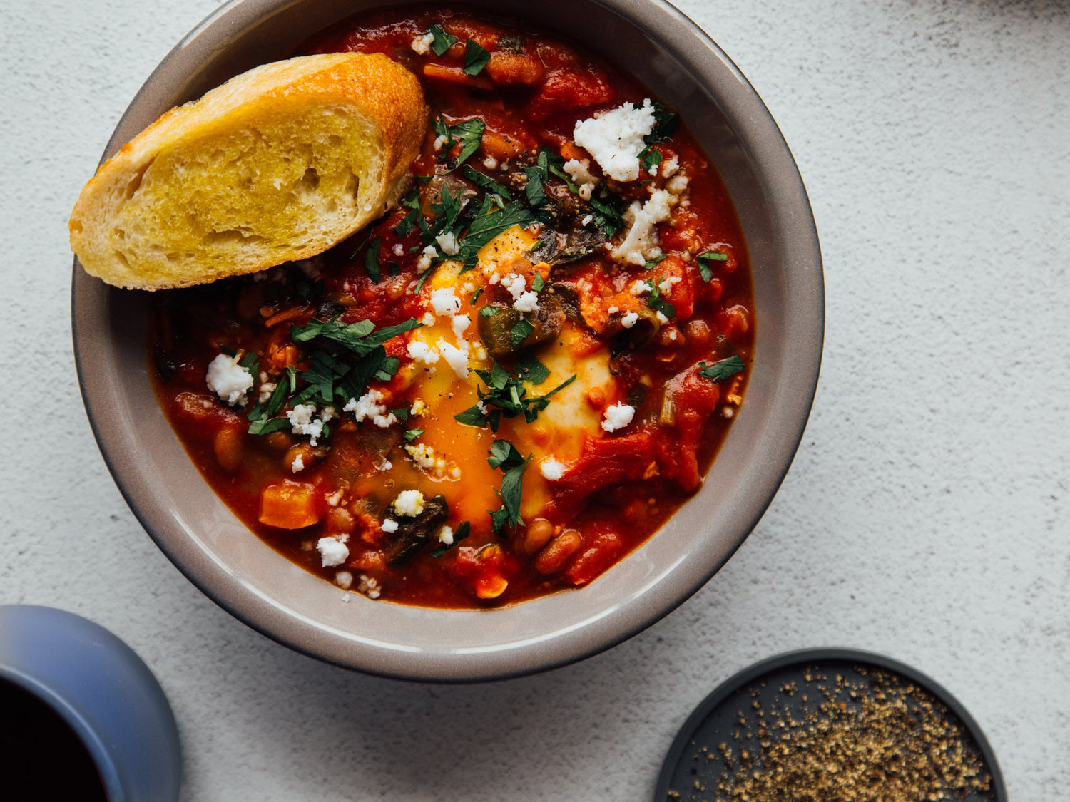 - Remove from heat, finish with pepper, and divide between bowls. Top with crumbled feta and parsley.