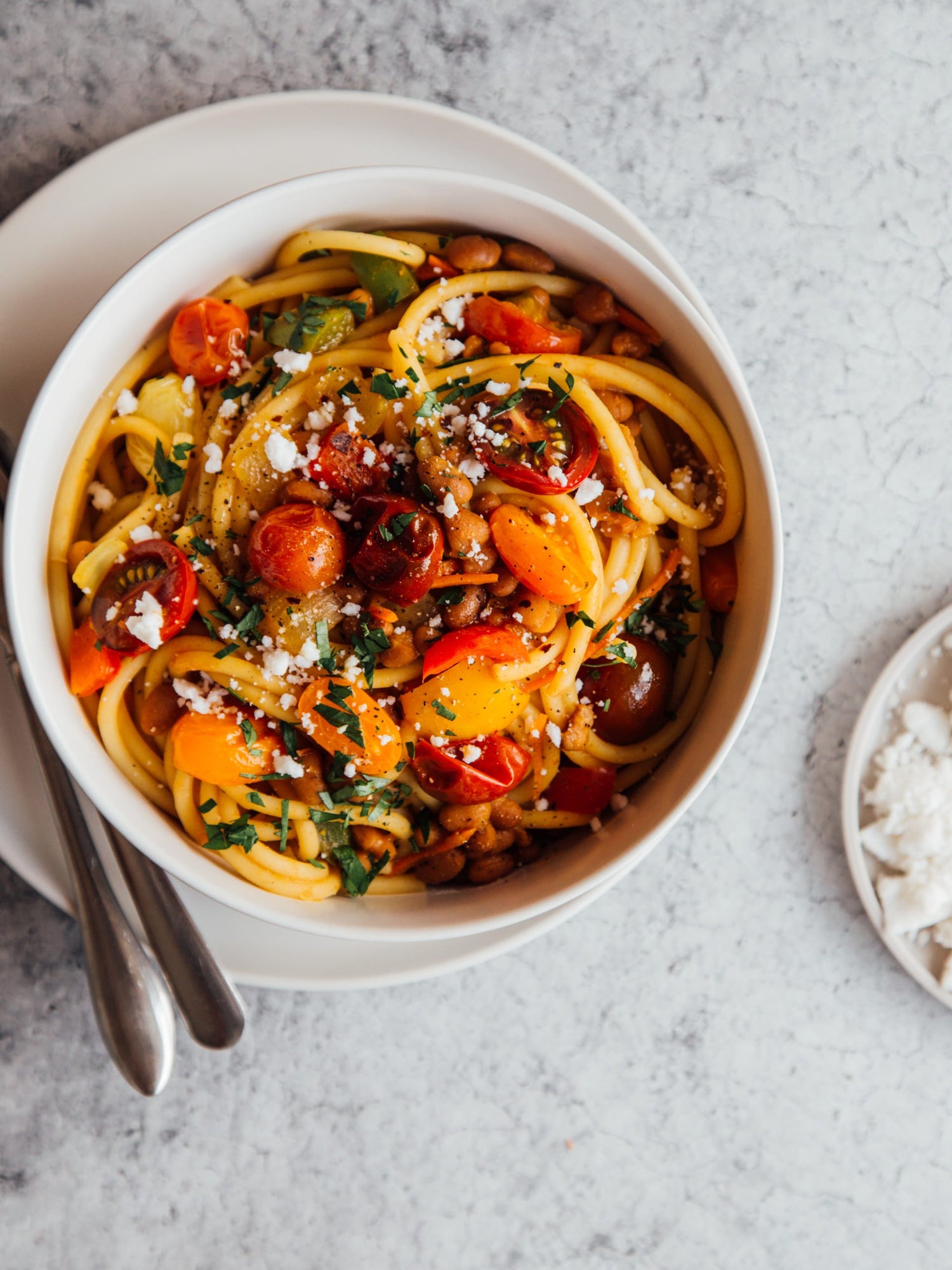 - Add drained noodles to skillet and toss everything to combine. Divide between bowls, top with blistered tomatoes, fresh basil, and feta. Season with salt and pepper, if desired.