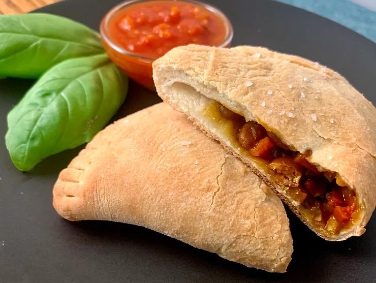 - Fold the calzone over itself and seal the edges with a fork. Repeat with the rest of the dough and fillings.