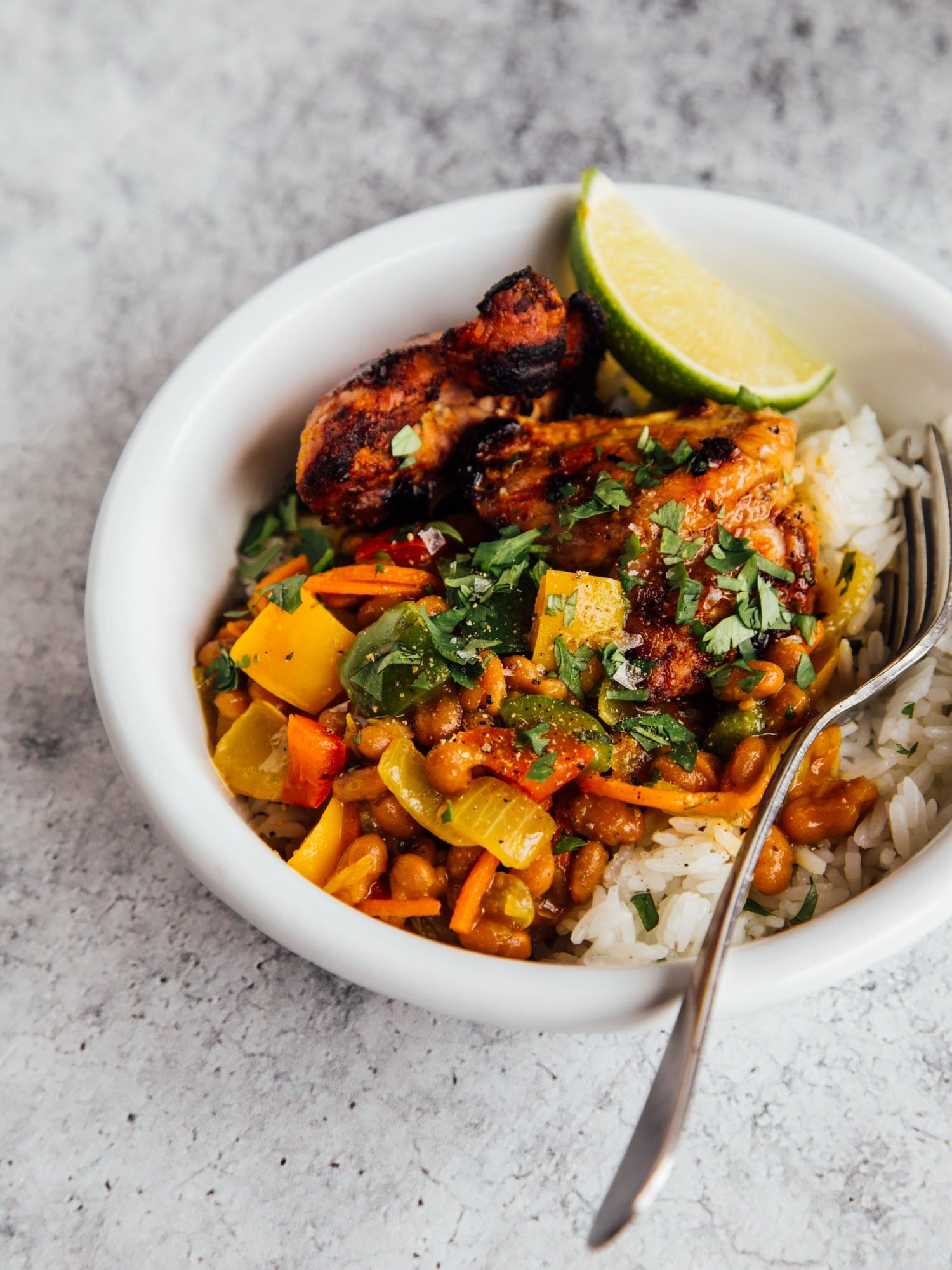 - Divide rice between bowls and top with chakalaka, grilled chicken thighs, and cilantro. Serve with a wedge of lime.