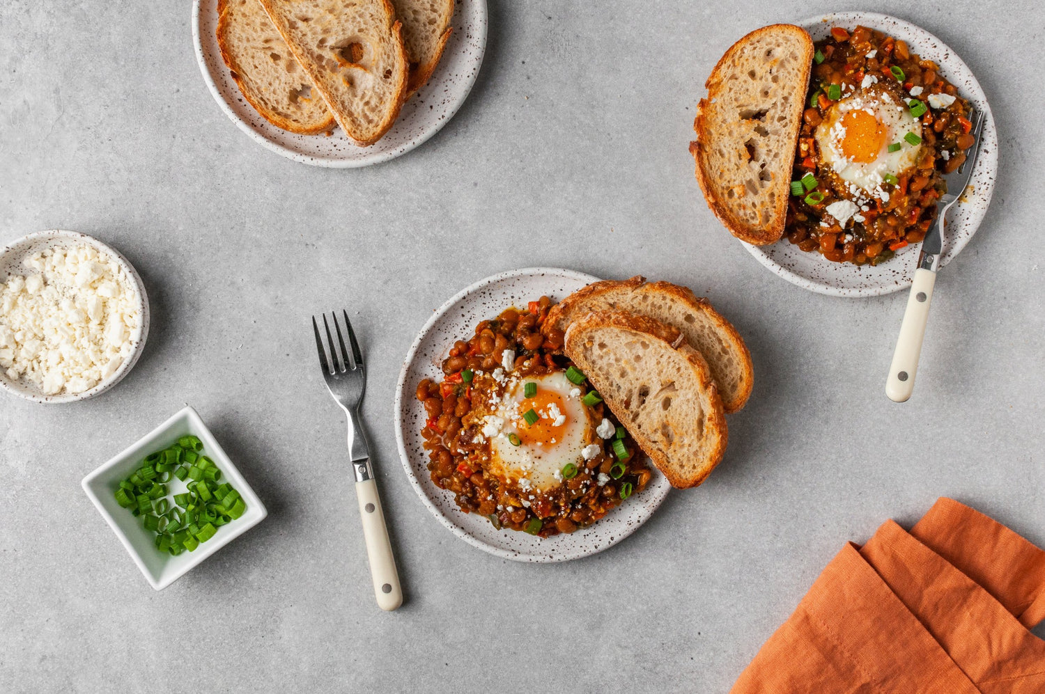 - Garnish the dish with crumbled feta and sliced scallions. Split into individual portions and serve alongside crusty toasted bread.
