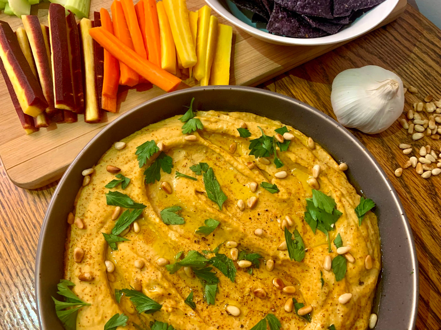 - Spoon your hummus into a bowl. Top with more olive oil, Cajun seasoning, and the toasted pine nuts. Place in the fridge for 2 hours minimum. Serve chilled.